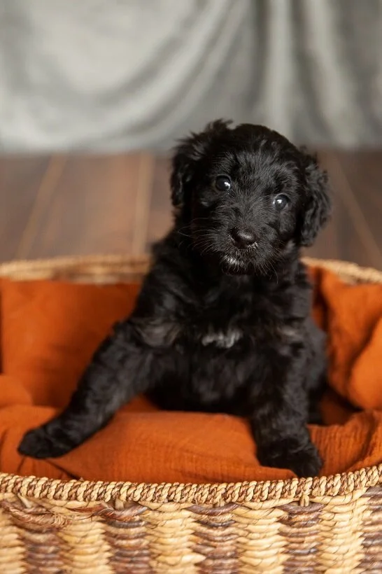 Our eight Aussie Doodle puppies arrived right on their due date of April 18th, 2021. The litter of 4 boys and 4 girls take after their Black Tri-colour Australian Shepherd mother “Bindi” and their blue Standard Poodle father, “Cooper” with black luxurious coats punctuated with copper and white markings.